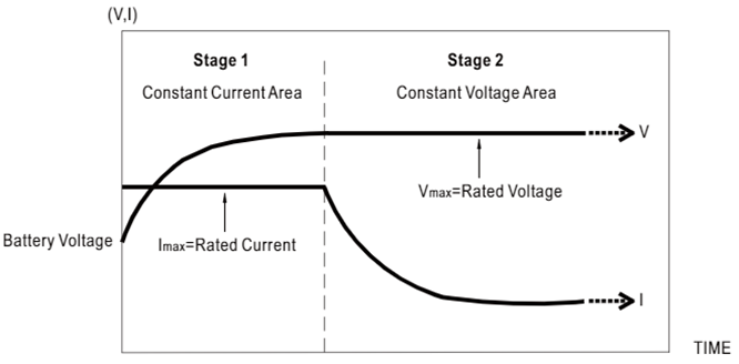 單一的鋰電池額定電壓可在3.2 V 到4.4V之間。最大充電電流可達(dá)1C。需注意不同廠商生產(chǎn)的相同化學(xué)成分鋰電池也往往有不同的額定電壓及電流。客戶需根據(jù)電池規(guī)格為準(zhǔn)。與鉛酸電池不同,鋰電池不接受高于自身額定電壓的充電壓且自放電速率極低。因此鋰電池常選用無(wú)浮充模式的二段式充電(圖二)