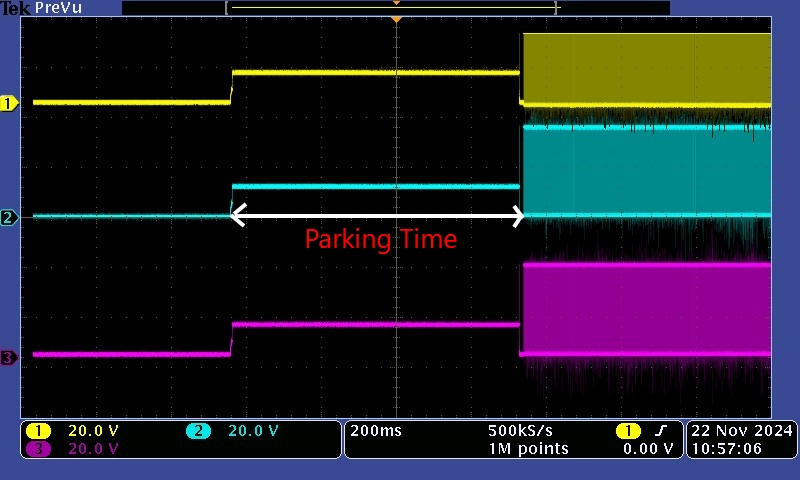 如圖 2 所示,在馬達啟動過程中,存在一個停放階段(parking phase),此時U、V和W三相信道輸出電壓以校準轉子的位置。在完成這一檢測后,馬達會正式啟動,轉子開始旋轉。